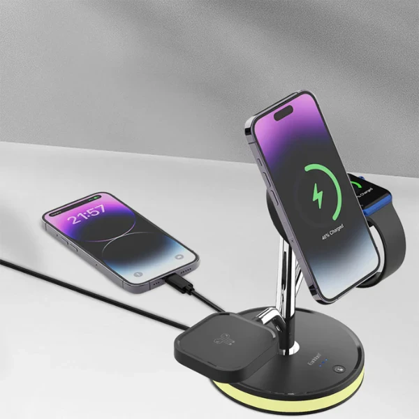 • Fonctions : Chargeur 4-en-1 capable d'alimenter simultanément un smartphone, une montre connectée, des écouteurs et un périphérique via USB-C.