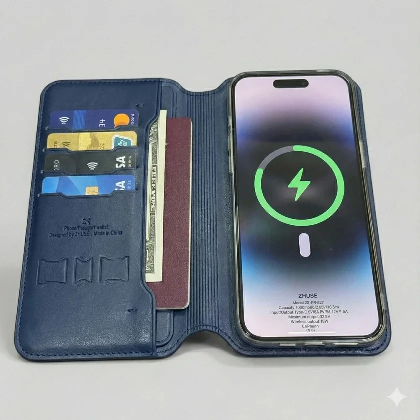 Le Zhuse ZS-PB-037 est une version évoluée du modèle 036. Il s'agit d'un portefeuille "intelligent" de grande capacité qui intègre une batterie externe magnétique. Contrairement aux modèles simples, celui-ci est conçu comme un véritable organiseur en cuir, permettant de ranger plusieurs cartes bancaires, de l'argent liquide et même des documents, tout en rechargeant votre smartphone sans fil grâce à la technologie MagSafe.