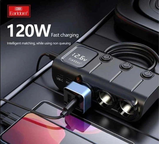 Chargeur de Voiture Rapide 120W Earldom ET-CS4 – Hub 8-en-1 avec 3 Sockets Allume-Cigare, 2x USB-C PD & 3x USB-A QC 3.0