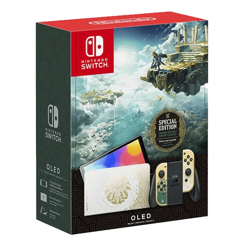 Cette édition spéciale arbore un design élégant avec le sceau d'Hyrule sur la station d'accueil (dock), des motifs mystérieux d'Hyrule à l'arrière de la console, et des manettes Joy-Con aux couleurs or et vert avec des symboles de jeu. Le modèle OLED apporte un écran plus grand et plus vibrant de 7 pouces, un support ajustable plus large et un port Ethernet filaire sur la station d'accueil.