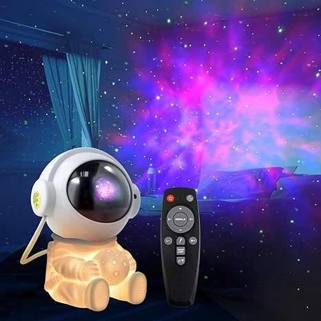 Ce projecteur transforme n'importe quelle pièce en un univers captivant. La tête de l'astronaute est fixée magnétiquement, ce qui lui permet de pivoter à 360° pour projeter des effets lumineux (nébuleuses et étoiles) sur les murs ou le plafond. L'appareil est généralement livré avec une télécommande qui permet de contrôler les couleurs, la luminosité, la vitesse des effets et de régler une minuterie d'arrêt automatique (45 ou 90 minutes). C'est un objet de décoration unique et un cadeau idéal pour les enfants et les passionnés d'espace.